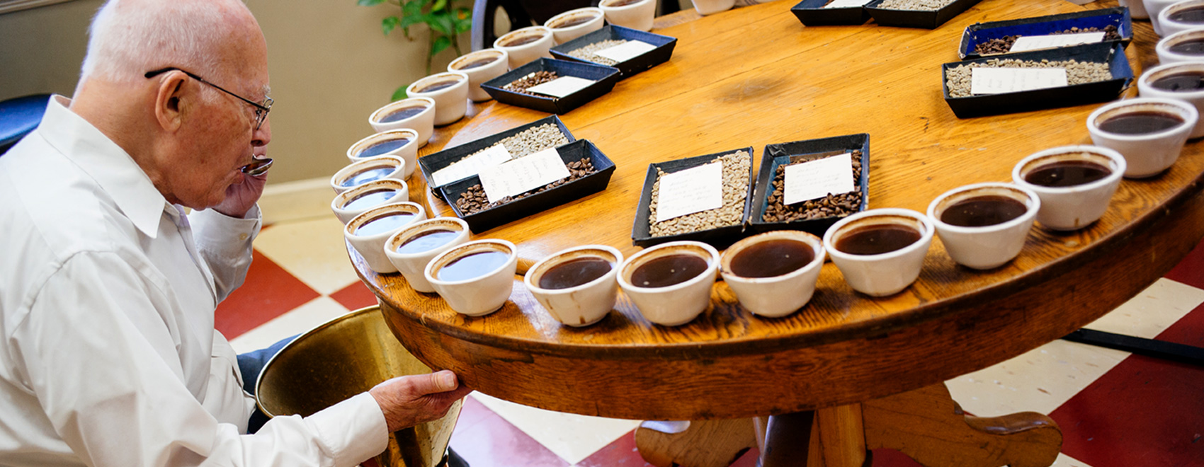 At New England Coffee, three people—all certified Q Graders—do all of the cupping. When they sit down at the family’s antique round cupping table that spins like a Lazy Susan, they practice a craft that has, over time, acquired its own choreography and language.
