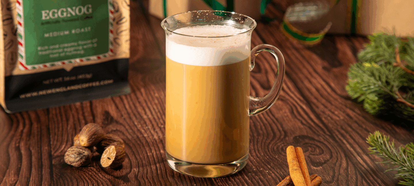Ingredients: 4-6 oz. fresh brewed New England Coffee Eggnog flavored coffee 2-3 oz. Eggnog 1 pinch of Nutmeg Directions: Brew and serve half a mug of our Eggnog Flavored Coffee. In a microwave safe pitcher, microwave your eggnog until scalded. Froth the eggnog with a handheld milk frother until it creates a thick foam. Gently […]