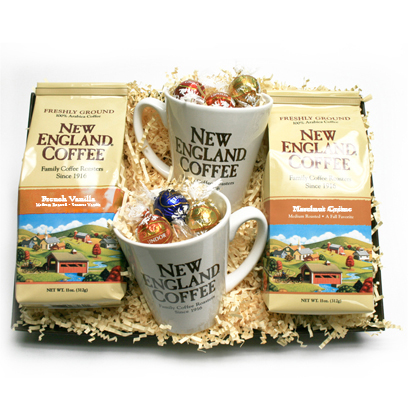 What could be better than a pair of your favorite New England Coffee Flavored Coffees? A pair of mugs to enjoy them from! Featuring our best-selling flavored coffees – Hazelnut Crème & French Vanilla – this basket has everything you need to have a great cup of coffee.