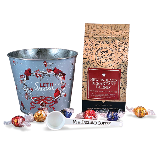 This cheerful holiday tin planter basket (color may vary) brings together everything you need for a cozy coffee moment and makes the perfect seasonal gift.