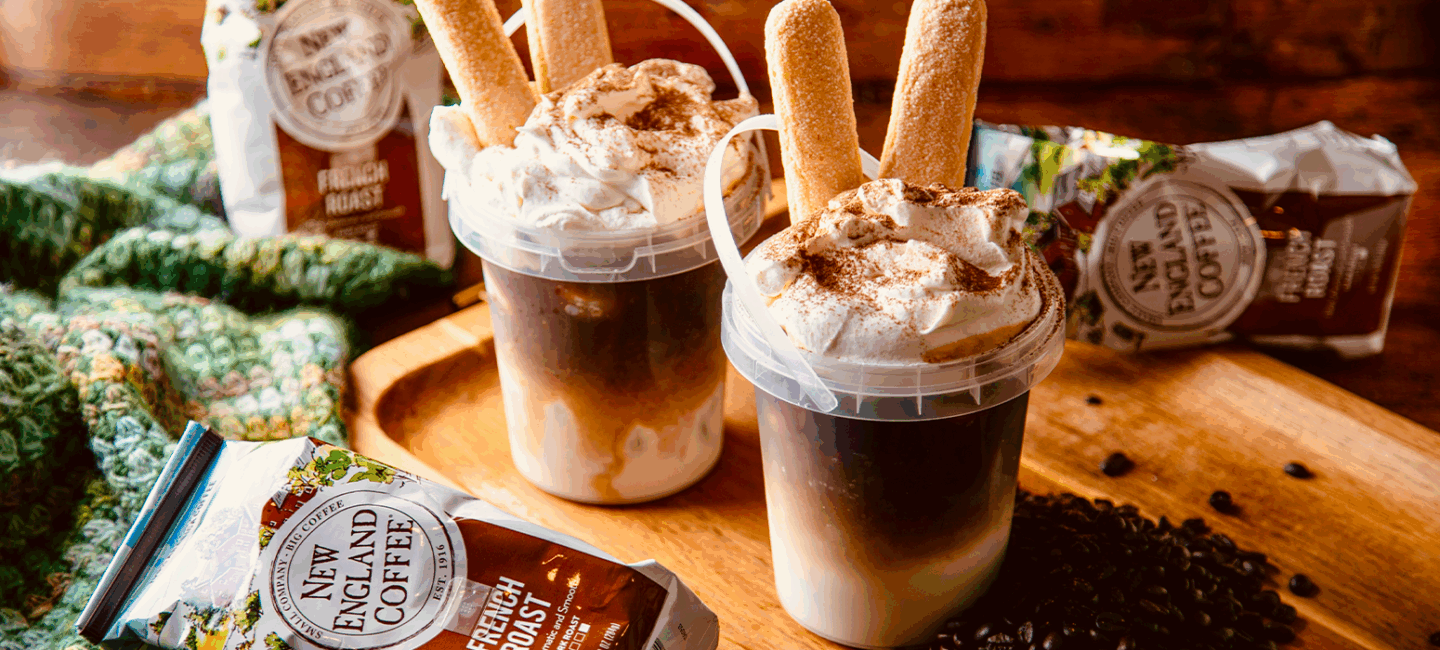 Assemble the bucket latte: Fill a 32-ounce clear bucket-style cup halfway with ice. Pour the cooled coffee over the ice, add the milk and vanilla syrup, and stir gently to combine. Spoon the mascarpone cream generously on top. Dust with cocoa powder and garnish with chocolate shavings or a drizzle of chocolate. Top with 1 or 2 ladyfinger cookies, if desired.